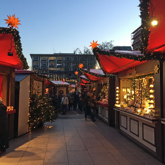 Weihnachtsmarkt are magical events where people gather to enjoy one another’s company. They are a fairy tale world come to life, particularly markets set at the foot of a castle or turreted section of ancient stone walls. Booths sell handmade woolens, leather or wood crafts. Stalls feature beer, wine, and especially glühwein, a hot German spiced wine. Short plays for children are performed. Father Christmas may walk through with wide-eyed children in his wake, or singers will mount a stage and sing festive Christmas songs. The walkways are festooned with lights and the smell of fresh pine trees and cinnamon fills the air. What makes Weihnachtsmarkt unique to open air Christmas craft markets I have been to in England and France is the sense of camaraderie, community and good cheer. In Cologne, where I mainly live when I’m in Germany, fourteen neighborhoods have their own market. Each has its own style and brings out everyone in the area for a cup of good cheer at the end of the day.